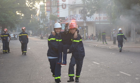 | Chiến sĩ cứu hỏa cứu hộ nạn nhân trong một vụ hỏa hoạn trên địa bàn TP. Buôn Ma Thuột. |