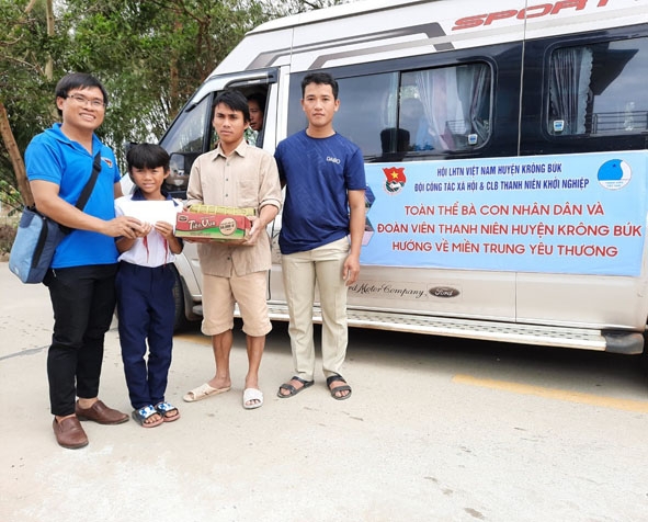 | Anh Vũ Minh Cường (bìa trái) tặng quà cho hộ dân bị thiệt hại bởi lũ lụt ở tỉnh Thừa Thiên - Huế. |
