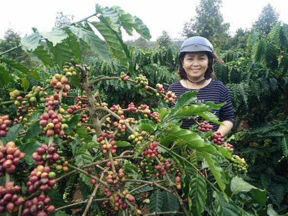 | Nhờ áp dụng khoa học kỹ thuật vào sản xuất, vườn cà phê của chị Lan cho năng suất cao. |
