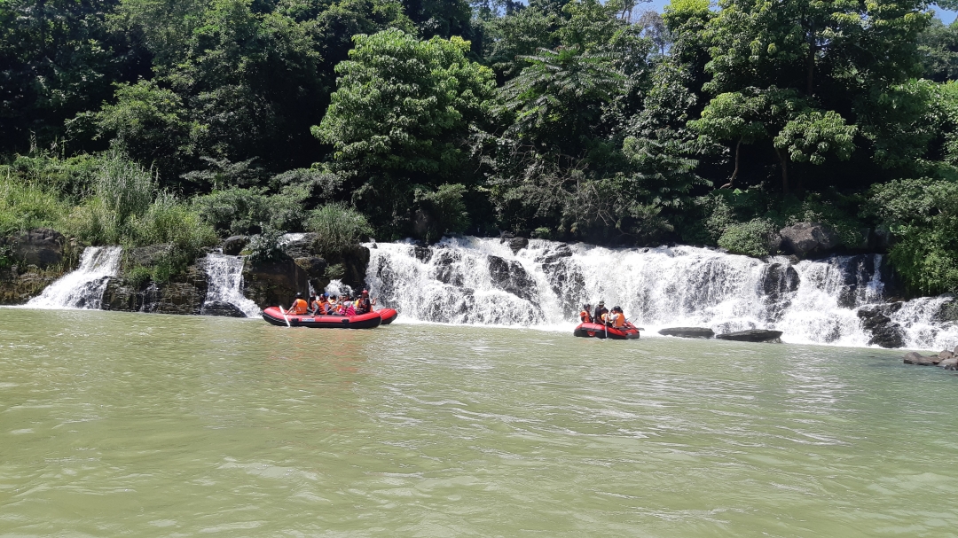 | Du khách tham gia du lịch trải nghiệm tại cụm thác Gia Long - Dray Nur thuộc địa bàn xã Dray Sáp. |