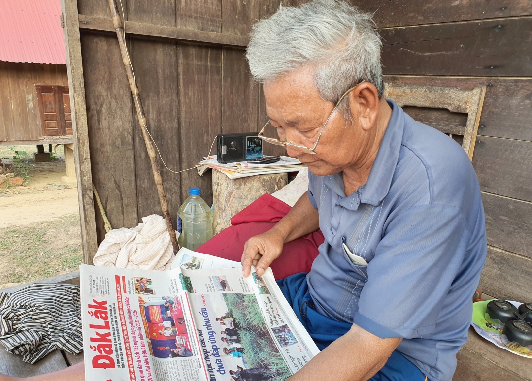 Từ trong nhà nghe tiếng gõ cửa, nhưng phải mất nhiều phút sau, ông Nguyễn Đình Thắng (thôn 4, xã Ea Bung) mới ra gặp mọi người. Trở về sau chiến tranh, đôi mắt và sức khỏe ông yếu dần, đến nay thì không thể nhìn thấy gì nữa. Hai vợ chồng tuổi già, sống trong ngôi nhà gỗ lụp xụp, không đủ sức lao động nên chỉ làm việc lặt vặt trong vườn. Được hỗ trợ 50 triệu đồng xây dựng nhà Đại đoàn kết đúng dịp cuối năm 2020, ông rưng rưng niềm vui khó tả. “Hơn 20 năm sống trong căn nhà gỗ nhỏ, vợ chồng tôi chẳng bao giờ dám mơ ước xa xôi. Nay được hỗ trợ làm nhà, lại gần đúng dịp Tết Nguyên đán, niềm vui như nhân đôi vậy. Từ nay trái gió trở trời, chúng tôi không còn phải lo mưa rét hay nắng nóng nữa”, ông Thắng trải lòng.