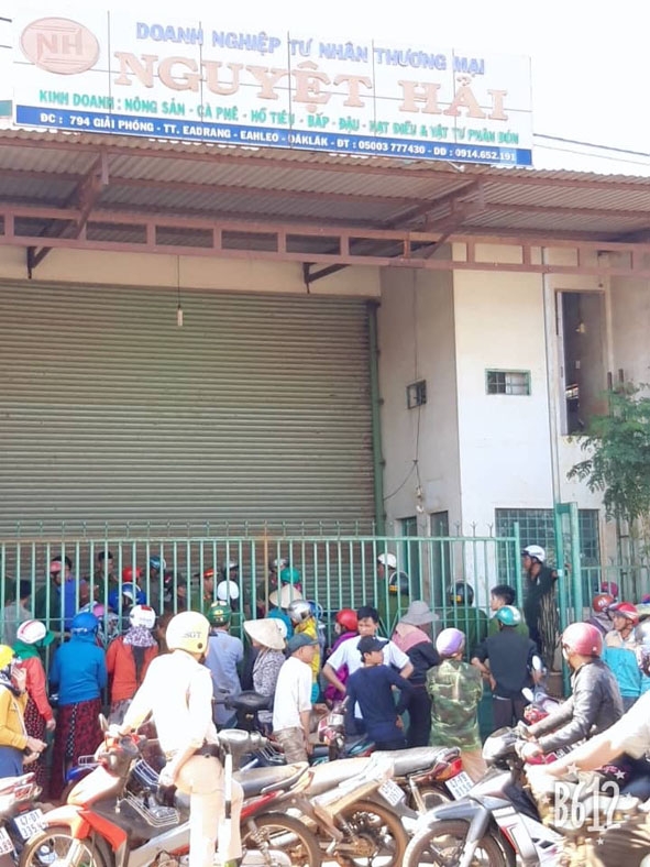 | Người dân tập trung trước đại lý kinh doanh cà phê Thành Lớn, xã Ea Nam, huyện Ea H'leo (chụp ngày 14-3). |