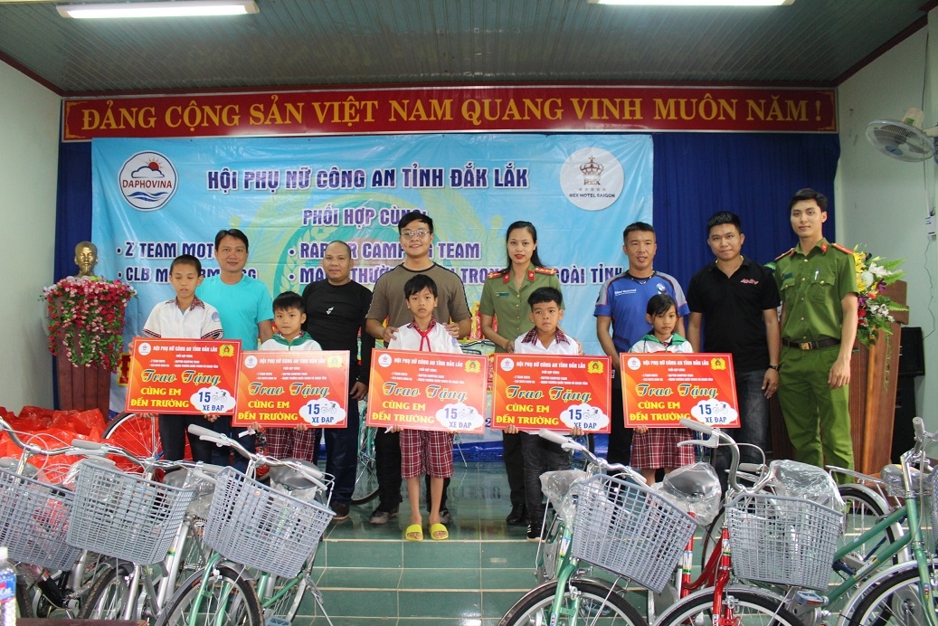 Đồng hành cùng học sinh vùng khó đến trường, mùa tựu trường năm học 2020 - 2021, Hội Phụ nữ Công an tỉnh đã tặng 70 chiếc xe đạp trị giá gần 130 triệu đồng cho học sinh các huyện Ea Súp, Krông Pắc, Krông Búk, Ea H’leo, Krông Năng… Tháng 8 vừa qua, Hội Phụ nữ Công an tỉnh tiếp tục phối hợp với các mạnh thường quân trong và ngoài tỉnh trao 22 chiếc xe đạp tặng học sinh có hoàn cảnh khó khăn của Trường THCS Chu Văn An (xã Yang Tao, huyện Lắk). Vui mừng khi nhận được xe đạp mới, em H’Thu Du, học sinh lớp 7 nói: “Nhà ở cách trường gần 10 km, mỗi ngày em phải thức dậy từ rất sớm đi bộ đến trường, song cũng có hôm đến lớp muộn. Có được chiếc xe đạp mới em không phải thức dậy sớm và không lo đi học muộn nữa”.