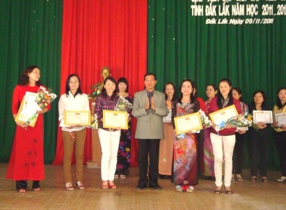 | Chủ tịch Công đoàn ngành Giáo dục Dak Lak trao Giấy chứng nhận giáo viên tiểu học đạt danh hiệu dạy giỏi cấp tỉnh năm học 2011-2012. |