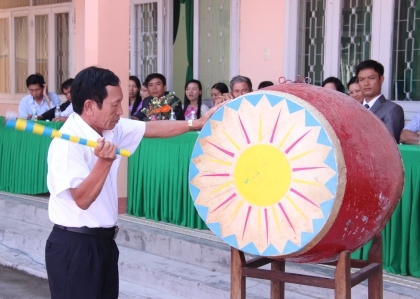 | Đại diện lãnh đạo huyện M'Drak đánh trống khai giảng năm học mới |