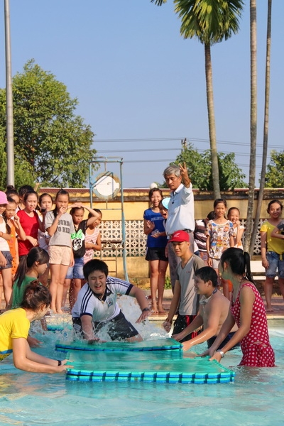 | Hấp dẫn nhất có lẽ là trò chơi "Vượt biển", các thành viên sẽ chạy trên các tấm thảm đặt trên mặt nước |