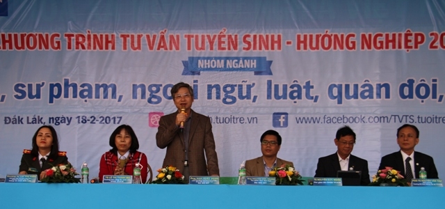 Sáng 18-2, tại Trường THPT Buôn Ma Thuột, 3.000 học sinh đến từ các trường THPT trong tỉnh đã tham gia Chương trình tư vấn tuyển sinh - hướng nghiệp năm 2017 do Báo Tuổi trẻ phối hợp với Bộ GD-ĐT, Sở GD-ĐT và Tỉnh Đoàn Đắk Lắk tổ chức.