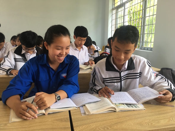 | Thầy giáo Bùi Anh Tuấn (ngoài cùng bên trái) chụp hình lưu niệm với các em học sinh Trường THPT Buôn Hồ tại một buổi sinh hoạt lớp. |