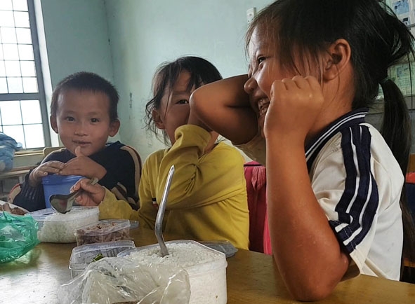 Học tại trường cả ngày, mà nhà xa nên học sinh tự mang theo cơm để ăn và nghỉ trưa tại trường. Nhìn những phần ăn thấy chủ yếu là cơm rau, rất hiếm hoi thịt cá. Có em ăn cơm với vài thìa đường bé xíu, có em chỉ ăn gói mì tôm sống. Có em bố mẹ đi làm rẫy xa nhiều ngày mới về, có khi cũng chẳng có đồ ăn gì để mang đến lớp. Thương học trò, thầy cô giáo thường xuyên san sẻ phần cơm của mình, hay bớt đồng lương ít ỏi cho các em mua bánh mì, mì tôm lót dạ. “ Các thầy cô ai cũng nhà xa nên phải mang theo cơm trưa, ai cũng cố mang theo nhiều cơm để có thể san sẻ cho các em lúc lỡ bữa. Ở đây là vùng khó khăn, giúp được gì cho để động viên các em đến lớp giáo viên bọn mình cố gắng làm”, cô Lâm Thị Thùy My, giáo viên chủ nhiệm lớp 3B2 bộc bạch.