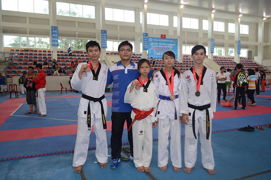| Thầy Mai Văn Chuyền (thứ hai từ trái sang) và các học sinh đoạt huy chương trong Hội khỏe Phù Đổng toàn quốc lần thứ IX năm 2018. |