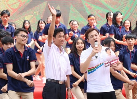 | Học sinh điểm cầu Trường THPT Ngô Gia Tự (huyện Ea Kar) dõi theo, cỗ vũ nhiệt tình cho thí sinh Vũ Quốc Anh |