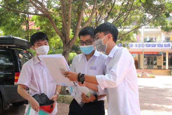 | Thí sinh tại điểm thi Trường THPT Lê Hữu Trác (huyện Cư M'gar) trao đổi bài làm sau khi kết thúc buổi thi. |