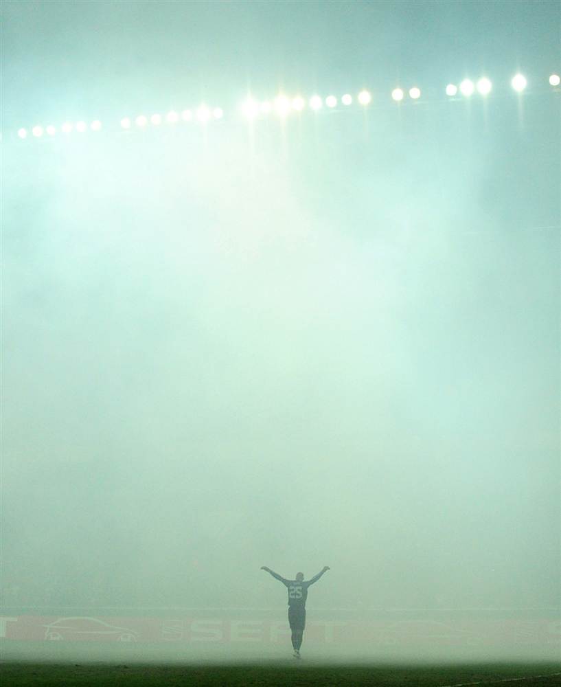 Đứng giữa làn khói là thủ môn Pepe Reina của CLB Liverpool trong trận đấu gặp CLB Sparta Prague, ở Cup Europa League, trên sân nhà của Sparta Prague, ngày 17-2. Trận đấu đã bị tạm hoãn do bom khói của các cổ động viên ném xuống sân. (