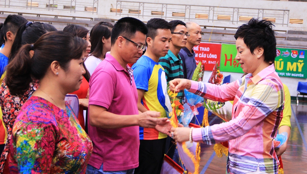Bà Nguyễn Thị Nhung, Trưởng bộ môn Bắn súng (Tổng cục TDTT) tặng hoa, cờ lưu niệm các đoàn vận động viên tham gia Giải. |