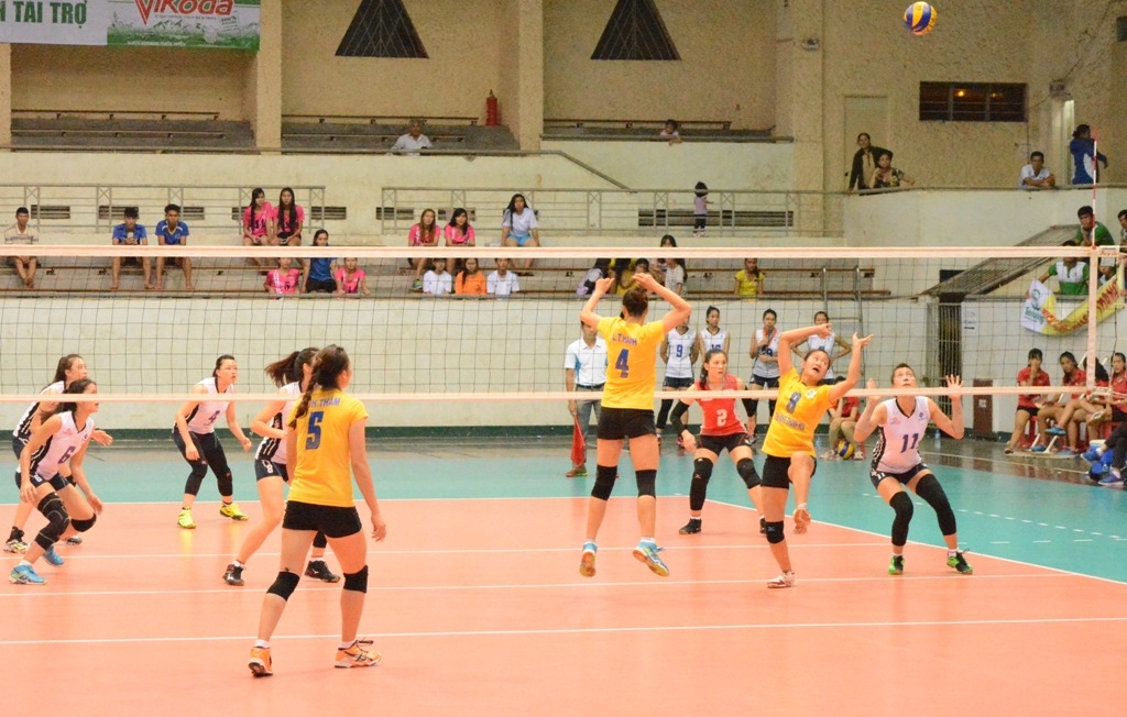 | Một pha bóng trong trận chung kết giữa Tiến Nông Thanh Hóa và Thông tin Lienvietpostbank. |