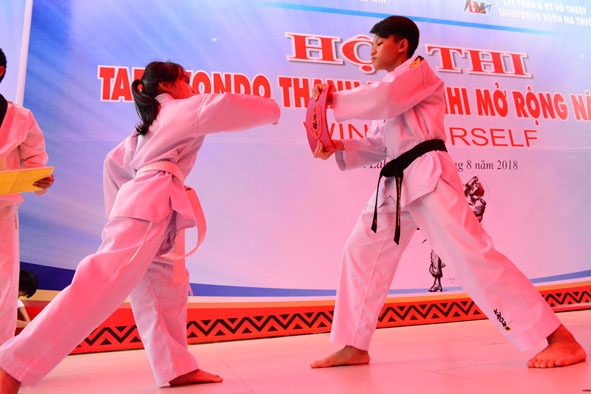 | Các võ sĩ biểu diễn công phá tại Hội thi karatedo thanh thiếu nhi mở rộng năm 2018. |