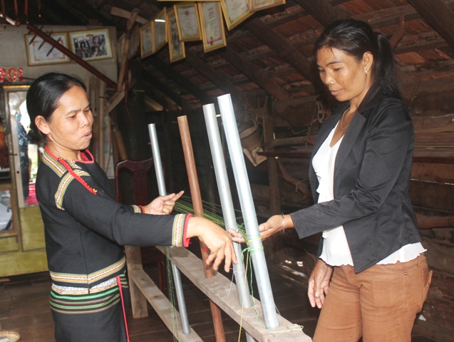 | Chị H’Juen (bên trái) đã truyền ngọn lửa đam mê nghề dệt thổ cẩm truyền thống đến nhiều chị em ở các buôn làng. |