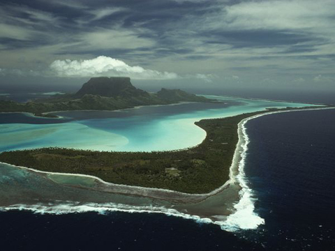 | Những đợt sóng xô vào bãi biển trên đảo Bora-Bora và để lại vô số bọt trắng xóa. Bora-Bora thuộc quần đảo Society thuộc Pháp. |