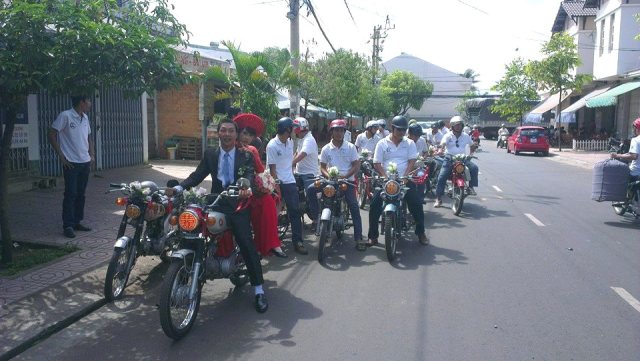 Ngày 20-10, người dân dọc tuyến đường từ xã Nam Dong, huyện Cư Jút (tỉnh Dak Nông) về TP. Buôn Ma Thuột đã rất ngạc nhiên và thích thú trước hình ảnh một đám rước dâu toàn bằng xe Honda 67.