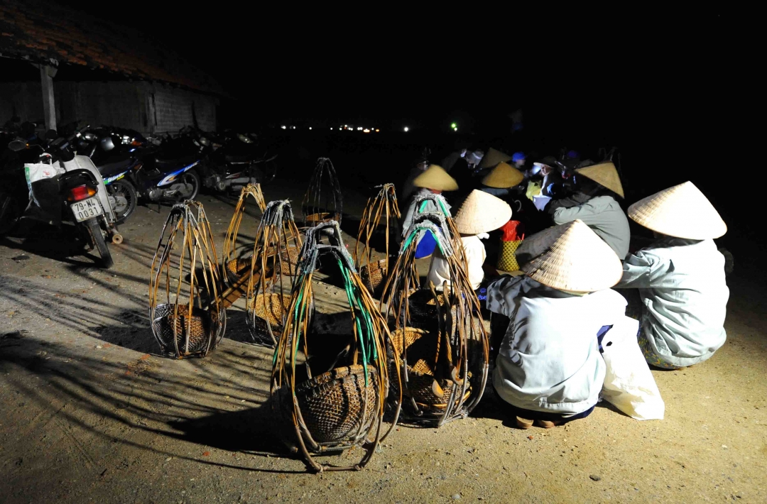 | Từ sáng sớm, khi gà còn chưa cất tiếng gáy, những công nhân làm muối đã quang gánh ra đồng |