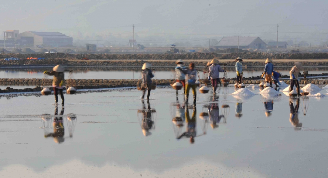 | Diêm dân phải bắt đầu công việc sớm để tránh cái nóng gay gắt hắt lên từ đồng muối |