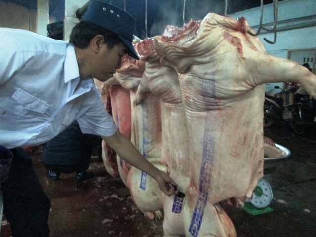 | Cán bộ thú y TP. Buôn Ma Thuột kiểm tra, đóng dấu trước khi cho đi tiêu thụ |