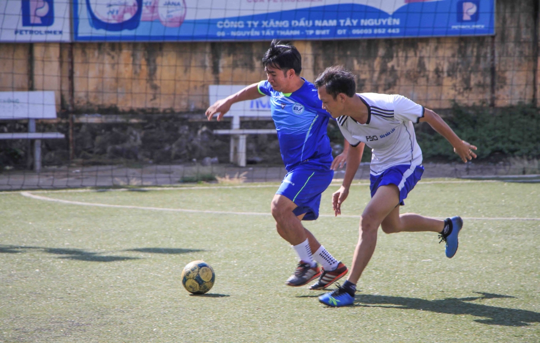 | Một pha bứt tốc của tiền vệ Công Định Báo Đắk Lắk (áo xanh) trước đối thủ Sở Thông tin - Truyền thông |