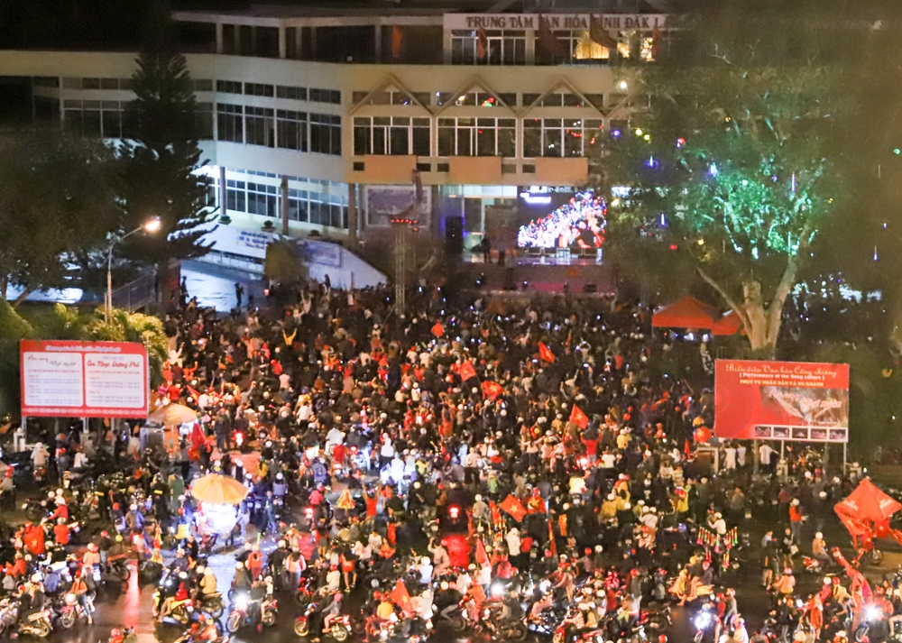 Sau tiếng còi mãn cuộc trận chung kết AFF Cup 2018 giữa đội tuyển Việt Nam và Malaysia, cờ Tổ quốc, băng rôn... tung bay trên các tuyến đường ở TP. Buôn Ma Thuột. Hàng nghìn cổ động viên đã đổ ra đường ăn mừng chiến thắng của đội tuyển Việt Nam sau 10 năm chờ đợi.