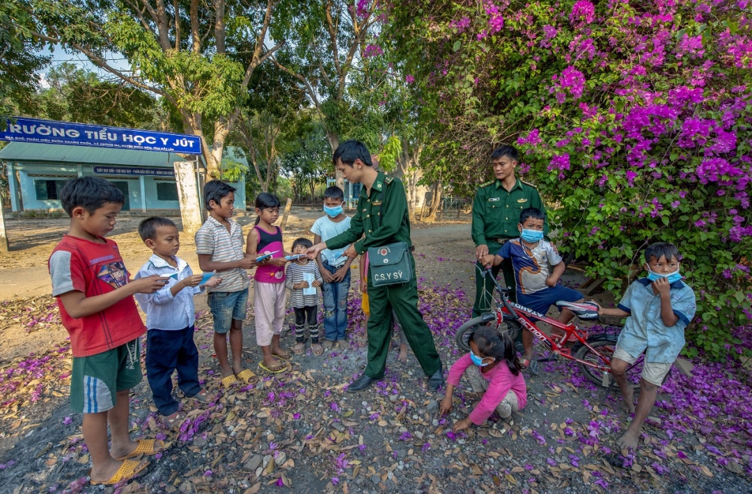 | Chiến sĩ Đồn Biên phòng Sêrêpốk hướng dẫn học sinh Trường Tiểu học Y Jút đeo khẩu trang phòng dịch. |