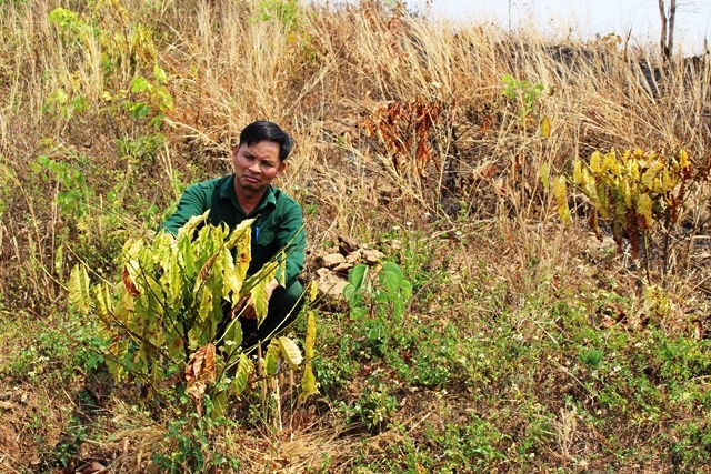 | 8 sào cà phê trồng được 2 năm của ông Y Bliêm Niê (buôn Cư Mtao, xã Ea Sin, huyện Krông Búk) dự kiến cho thu bói trong năm nay nhưng do không có nước tưới nên đang chết cháy. (Trong ảnh: Một cán bộ địa phương kiểm tra vườn cà phê của ông Y Bilêm). Ảnh: Như Quỳnh |