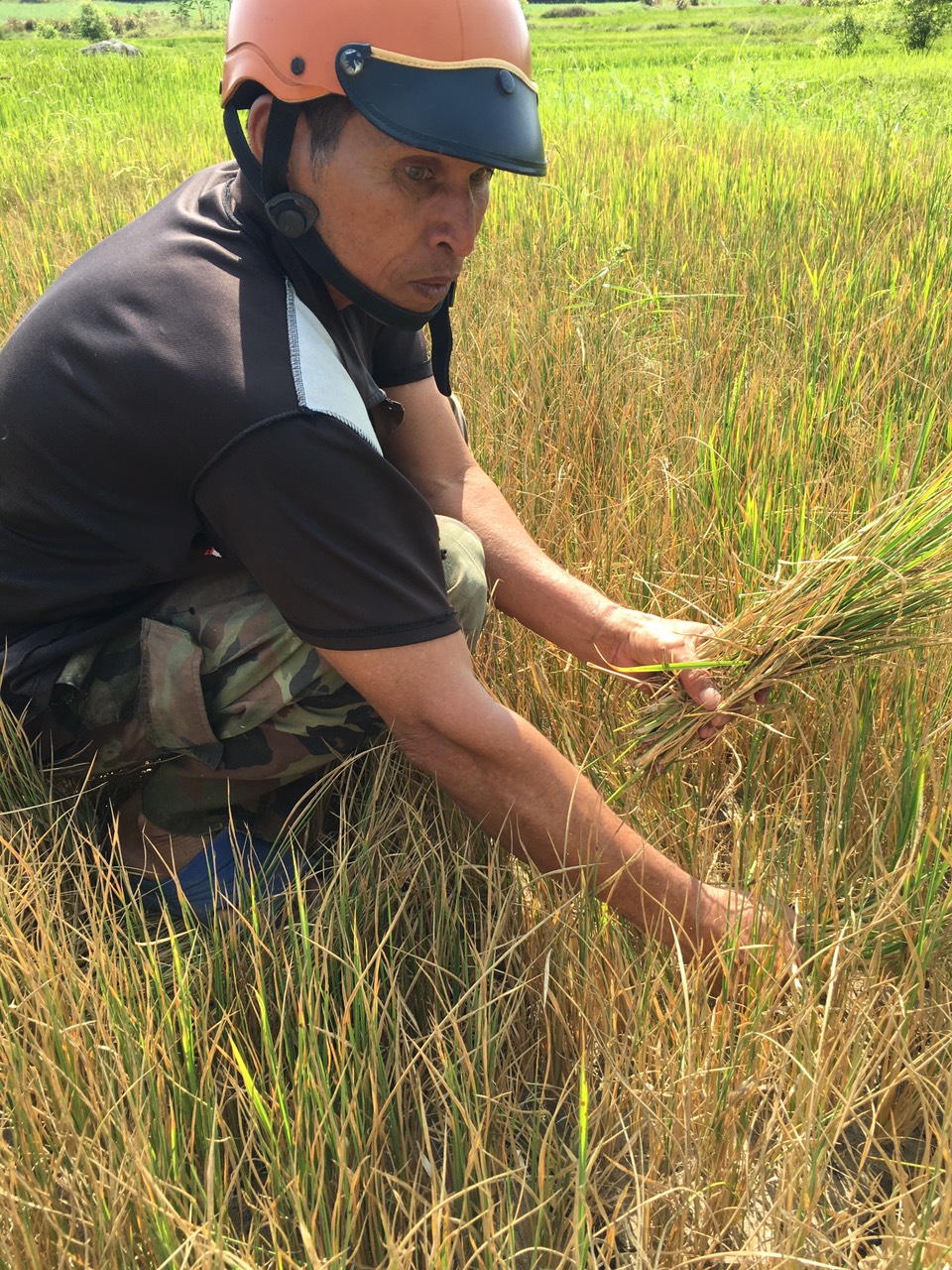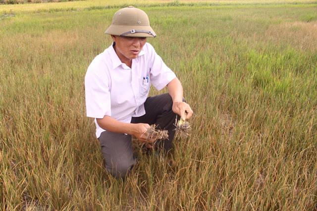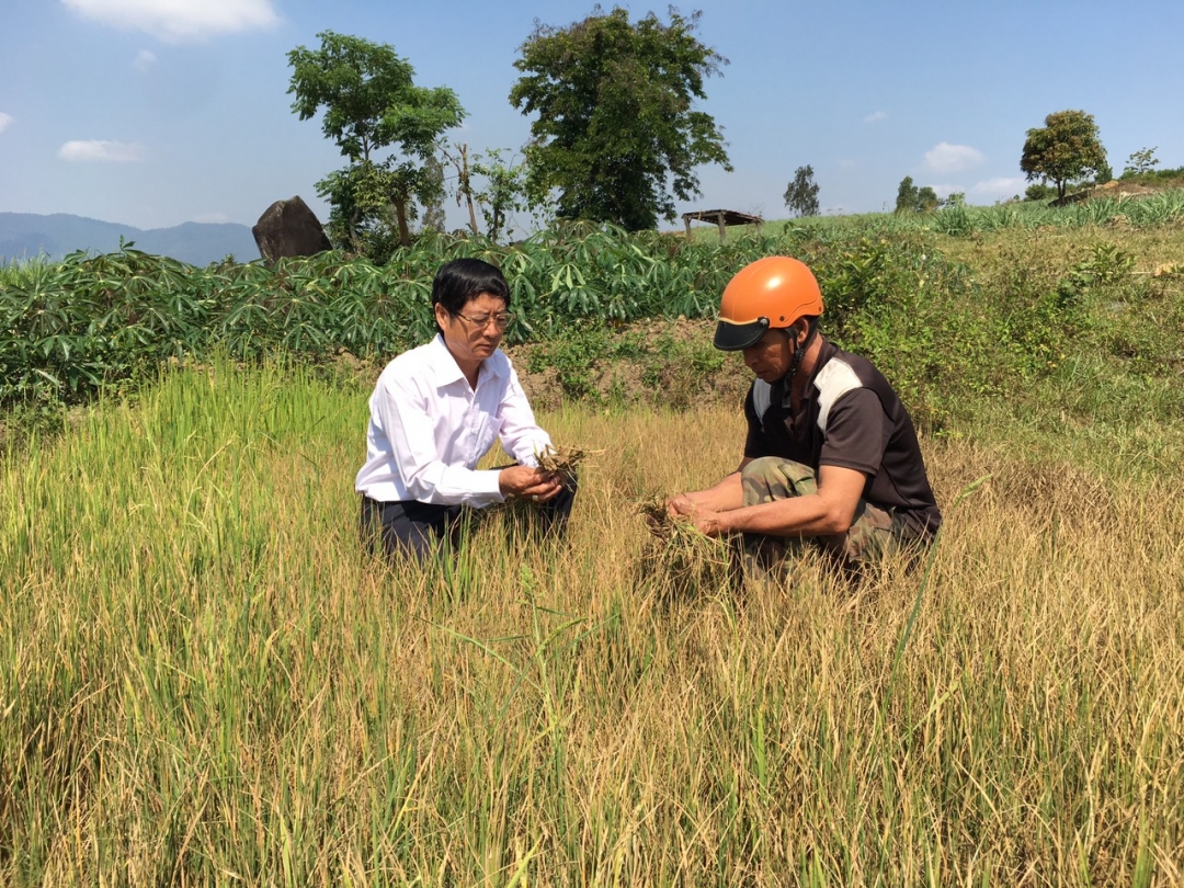 | Phó Chủ tịch UBND xã Ea Sar (huyện Ea Kar) Văn Đình Thìn kiểm tra diện tích lúa đông xuân 2019 - 2020 bị khô hạn ở cánh đồng buôn Sơ Đăng. Ảnh: Linh Ân |