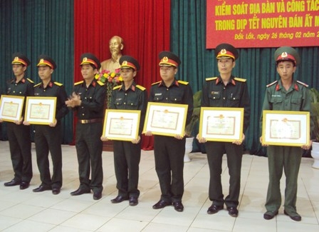 | Bí thư Tỉnh ủy Niê Thuật cùng đại diện các sở, ban ngành và đơn vị kết nghĩa thăm cán bộ, chiến sĩ Đồn Biên phòng Ia R’vê nhân dịp Xuân Ất Mùi 2015. Ảnh: Văn Nhương |