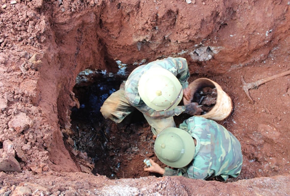 | Nhiệm vụ thu gom, dọn sạch bom mìn của người lính công binh rất vất vả, nguy hiểm. |