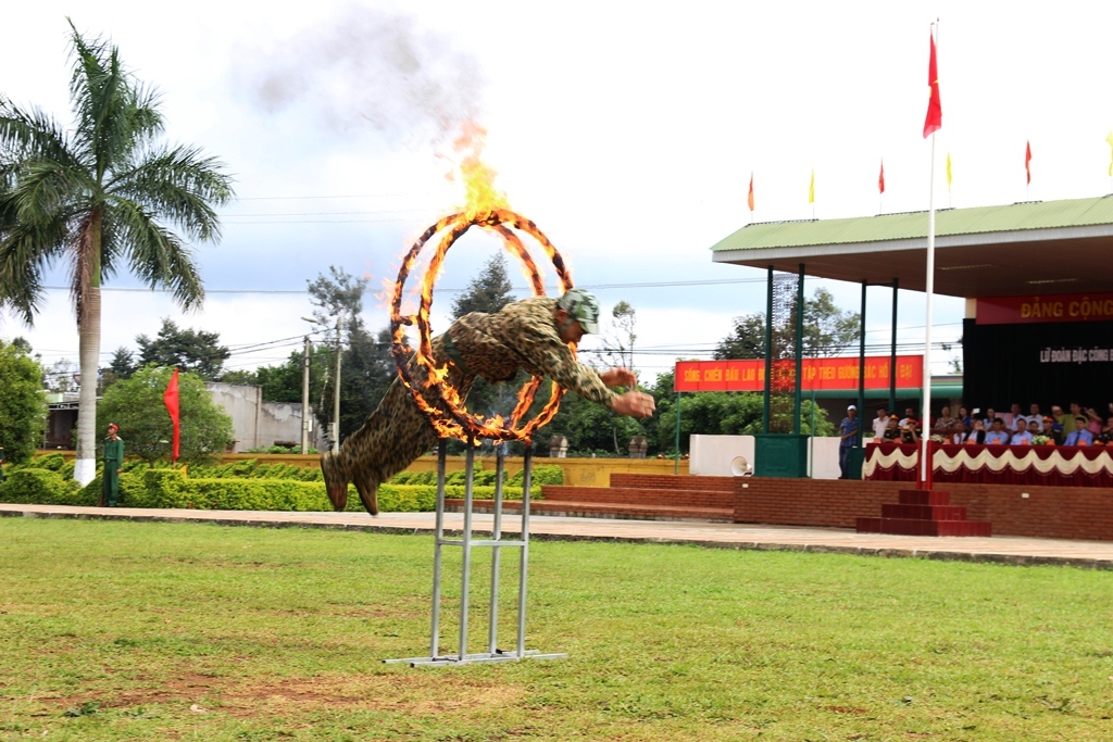 Bộ đội Đặc công biểu diễn vượt qua vòng lửa . Ảnh: Thế Hùng |