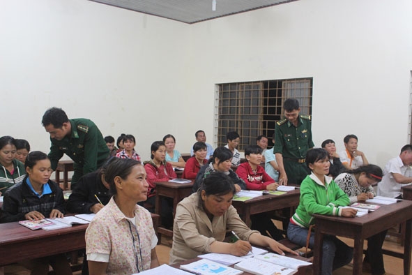 | Cán bộ Đồn Biên phòng Ea H'leo kiểm tra kết quả học tập của em Lang Thị Luận. |