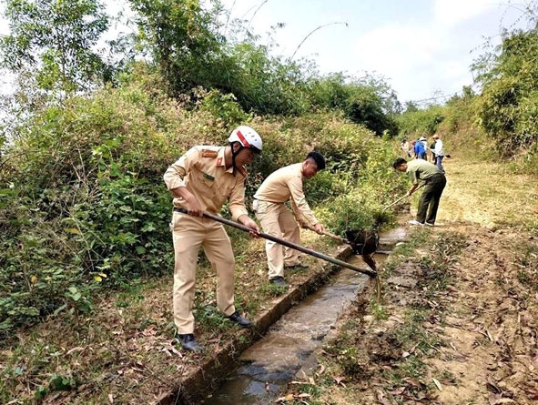 | Cán bộ, chiến sĩ Công an huyện Ea Kar tổ chức dọn vệ sinh, khơi thông cống rãnh tại xã Cư Yang (huyện Ea Kar). |