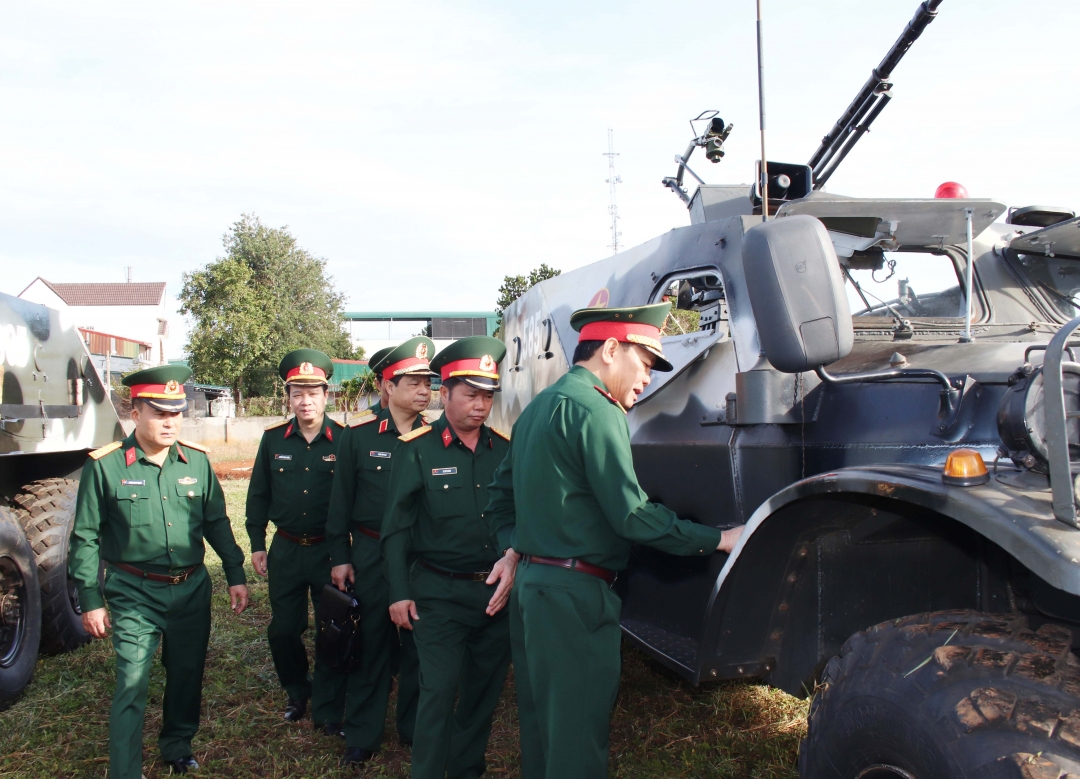 | Trung tướng Ngô Minh Tiến cùng Đoàn công tác kiểm tra tình trạng phương tiện kỹ thuật xe thiết giáp. |