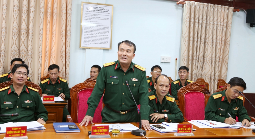 | Thượng tá Trần Minh Trọng, Chính ủy Bộ Chỉ huy Quân sự tỉnh phát biểu tại hội nghị. |