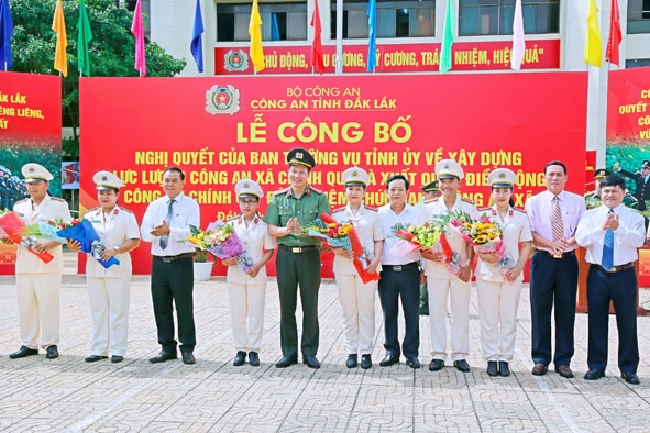 | Công an tỉnh tổ chức công bố thực hiện Nghị quyết số 11 về điều động lực lượng công an chính quy đảm nhiệm chức danh công an xã. Ảnh: Trọng Tính |