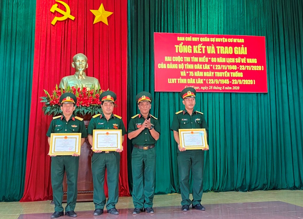 Ngày 28-8, Ban Chỉ huy Quân sự huyện Cư M’gar tổ chức Tổng kết và trao giải hai cuộc thi tìm hiểu 80 năm lịch sử vẻ vang Đảng bộ tỉnh Đắk Lắk (23-11-1940 – 23-11-2020) và 75 năm Ngày truyền thống lực lượng vũ trang tỉnh Đắk Lắk (23-9-1945 – 23-9-2020).