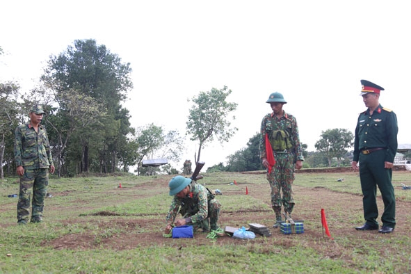 | Lính trẻ Tiểu đoàn 303 huấn luyện đánh thuốc nổ vào mục tiêu. |