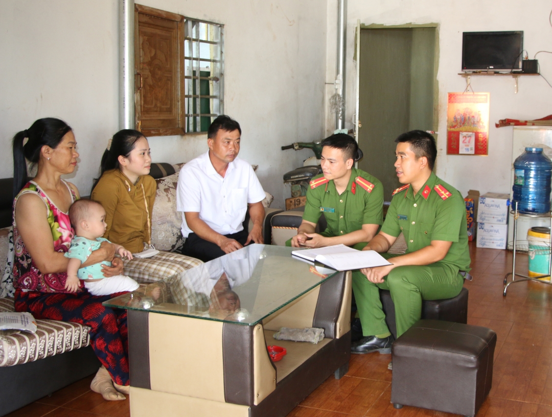 | Lực lượng Công an xã Cư Né đến nhà người dân để tuyên truyền phong trào Toàn dân bảo vệ an ninh tổ quốc. |