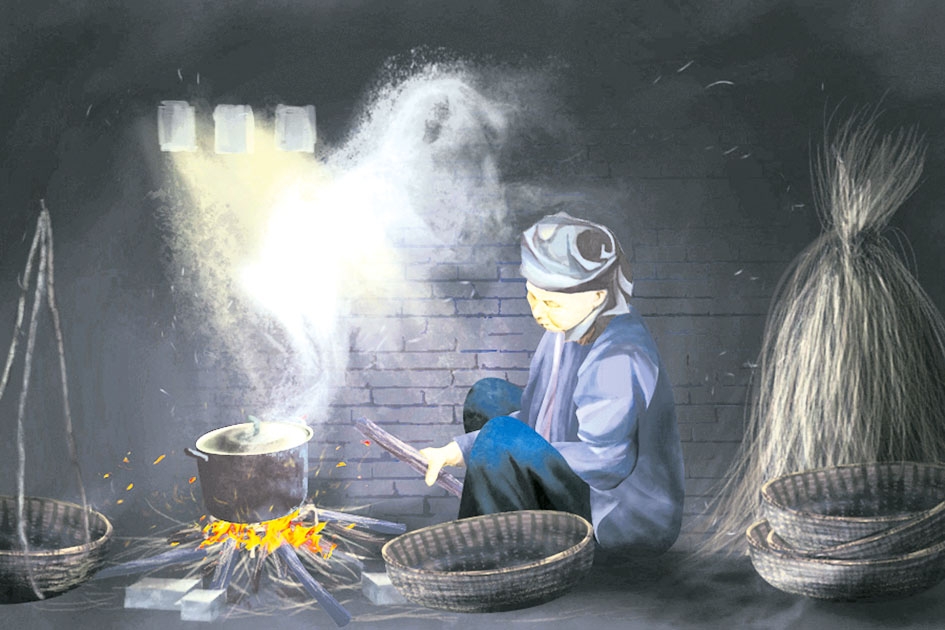 Khi nước bắt đầu rút, củi đã ráo, hàng xóm đã nghe tiếng ới của nhau cũng là lúc bếp lửa trên gác từng nhà bắt đầu được nhen nhóm. Ở quê dẫu khó khăn đến mấy thì ngôi nhà sẽ phải có cái gác để trú lũ. Gác là những tấm rỗ dày và ghép kín lại với nhau trên trần nhà. Để lửa bếp không làm gác nhà cháy sém, người quê hay lót một tấm sắt dày phía dưới kiềng bếp rồi trong lúc đun nấu cũng phải cẩn thận tránh than củi không vương vãi ra ngoài. Lúc nước rút xuống nền nhà thì bếp lửa cũng “rút” xuống giường, xuống phản gỗ theo con nước. Củi lửa ngày mưa lũ lập lòe, không đượm nồng như ngày thường. Cũng vậy, cơm quê ngày lũ chỉ được mỗi cơm trắng là món chính thôi. Còn thức ăn, nhà nào có muối mắm, muối cà dự trữ thì còn được mặn miệng không thì vài hạt muối đậu qua quýt xong bữa.