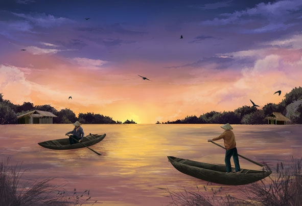 Con đường mới được thảm nhựa, láng mướt. Xe chạy băng băng. Xe đưa em đến quán nước nhỏ của bà cụ bên đường. Quán nằm yên ắng dưới giàn hoa sử quân tử, hoa nở từng chùm rực rỡ. Dưới cái nắng gay gắt của mùa khô, bóng mát của giàn hoa trùm lấy người, dịu dàng không thể chịu được.