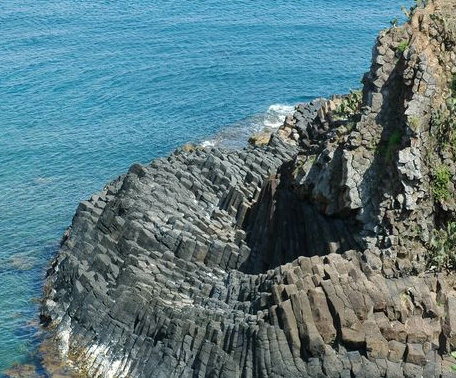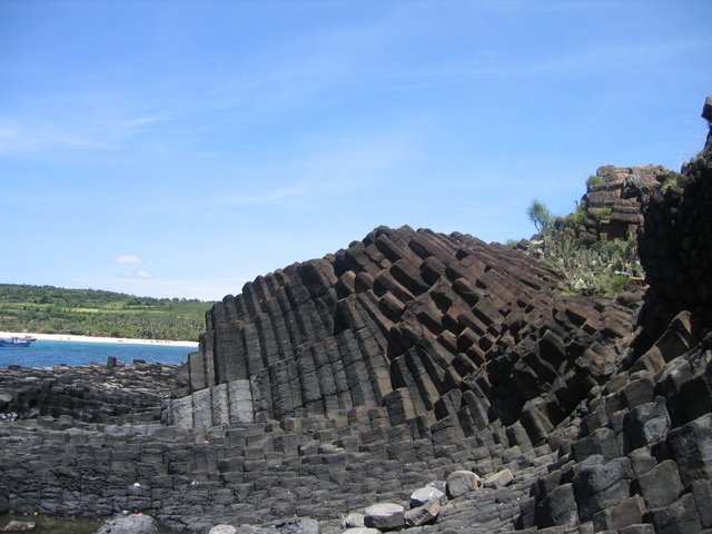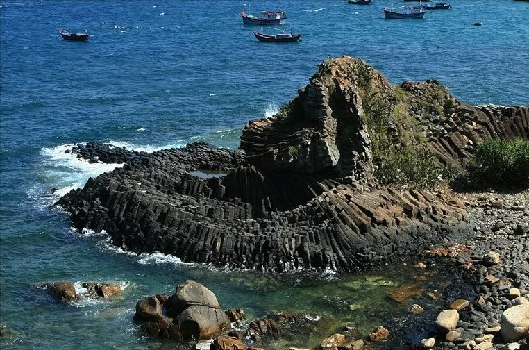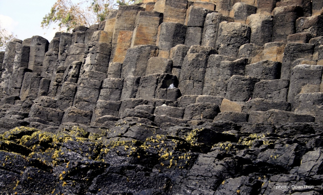 Những cột đá ở đây có màu đen huyền hoặc nâu vàng, nửa chìm nửa nổi trên mặt nước biển. Mỗi viên đá có độ dày từ 60-80 cm.