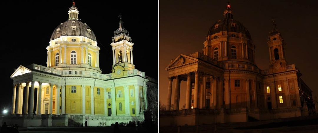 Nhà thờ Superga trước và trong Giờ Trái đất tại Turin (Italia). (