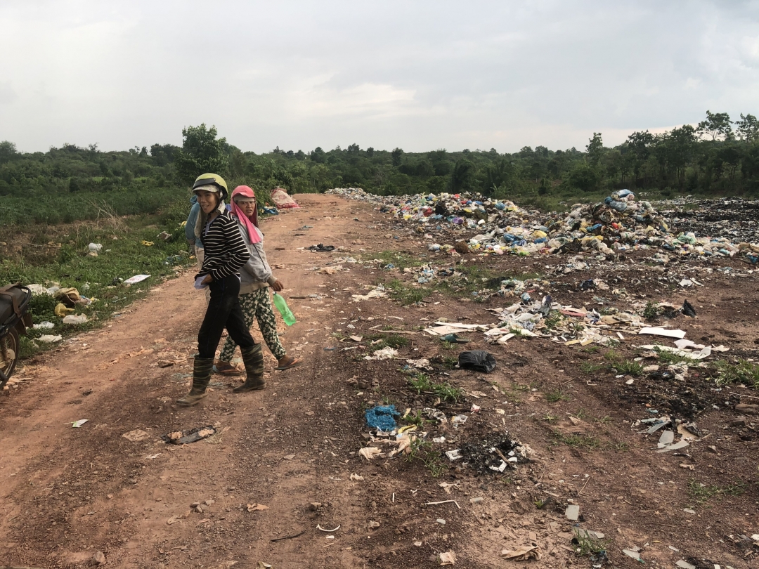 | Không có tường rào nên rác thải từ bãi rác tạm huyện Buôn Đôn tràn ra cả đường đi. |