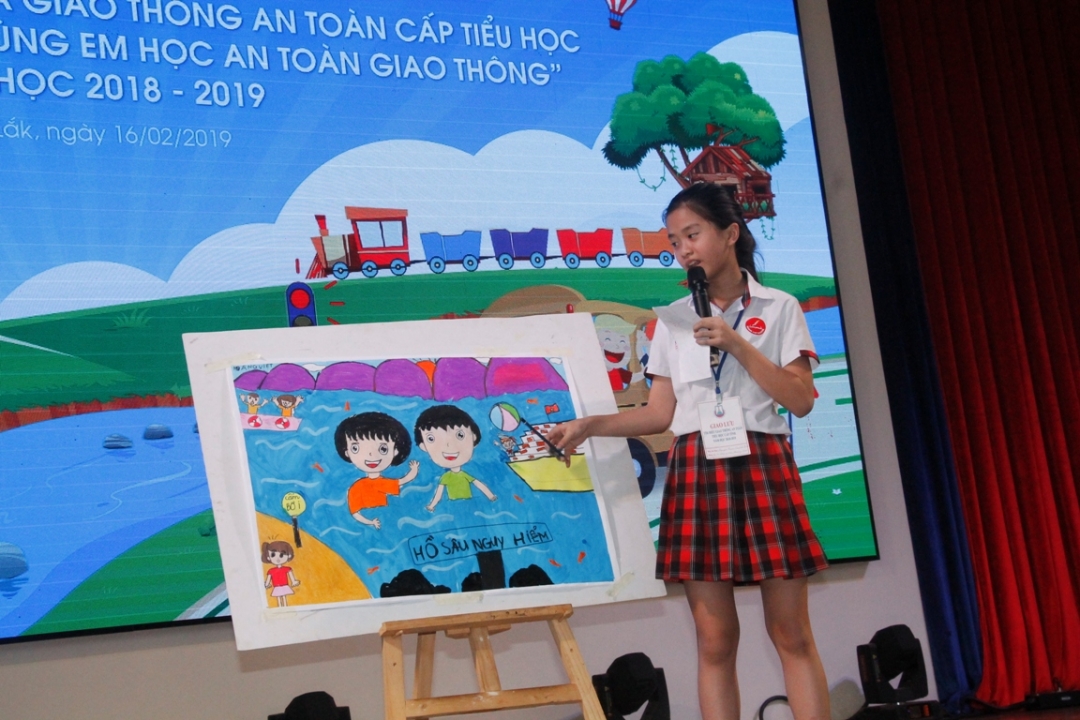 | Phần thuyết trình tranh tập thể về chủ đề ATGT của học sinh Trường Tiểu học, THCS, THPT Hoàng Việt. |