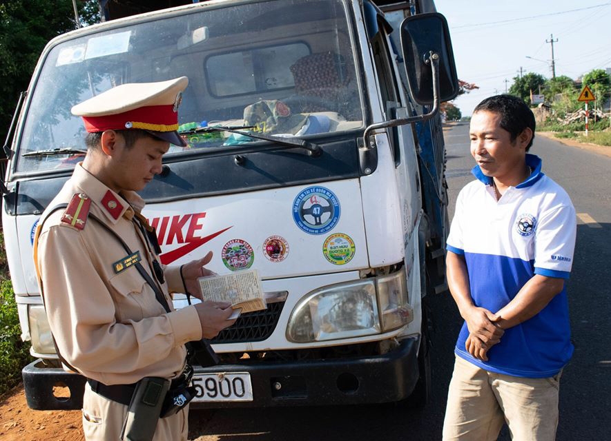 | Cán bộ Đội CSGT - Trật tự (Công an TP. Buôn Ma Thuột) tuyên truyền Luật Giao thông đường bộ cho học sinh. |