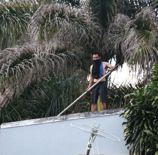 | Nam thanh niên có biểu hiện ngáo đá tay lăm lăm hung khí cố thủ trên mái nhà |